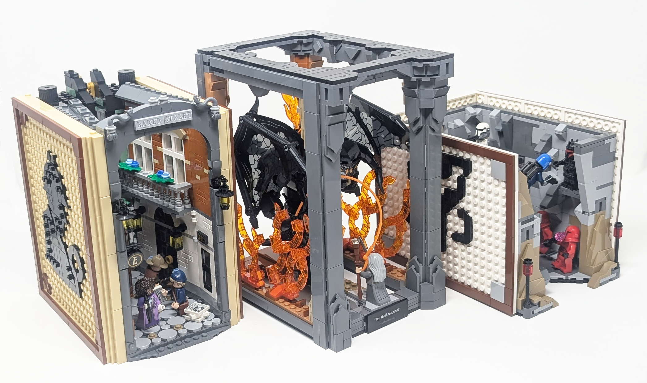 When viewed in its closed state, #10367 The Lord of the Rings: Balrog Book Nook commands attention with its height and dramatic framing, being 6 bricks taller than 10351 Sherlock Holmes Book Nook. The overwhelming 199Dark Stone GreyDark Bluish Gray helps with this as well. The set breaks from traditional Book Nook conventions as there are no side walls, meaning the scene isn’t nestled between the pages of a book, moreso serving as a shrine to the cinematic grandeur that it is based on. While the Balrog and Gandalf have accurate scaling, the scene itself is not as movie or book accurate in terms of size, with the Bridge of Khazad-dûm looking rather small, something that was likely a creative decision that had to be done to not have the piece count spiral out of control.