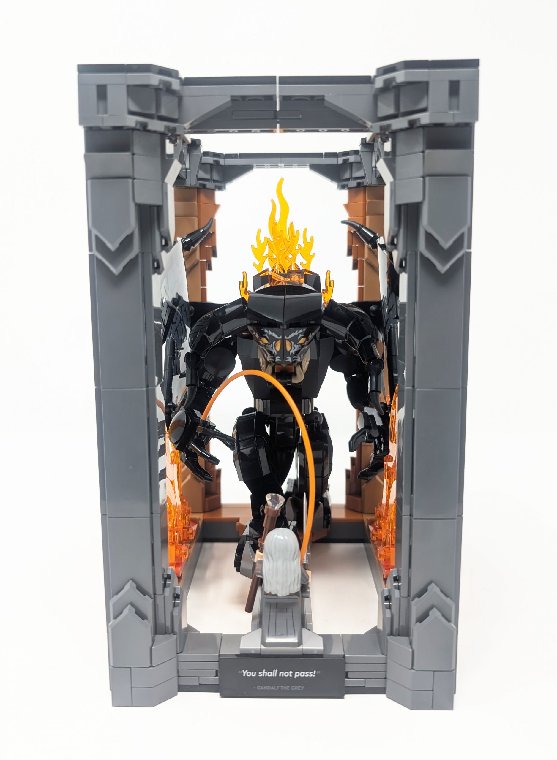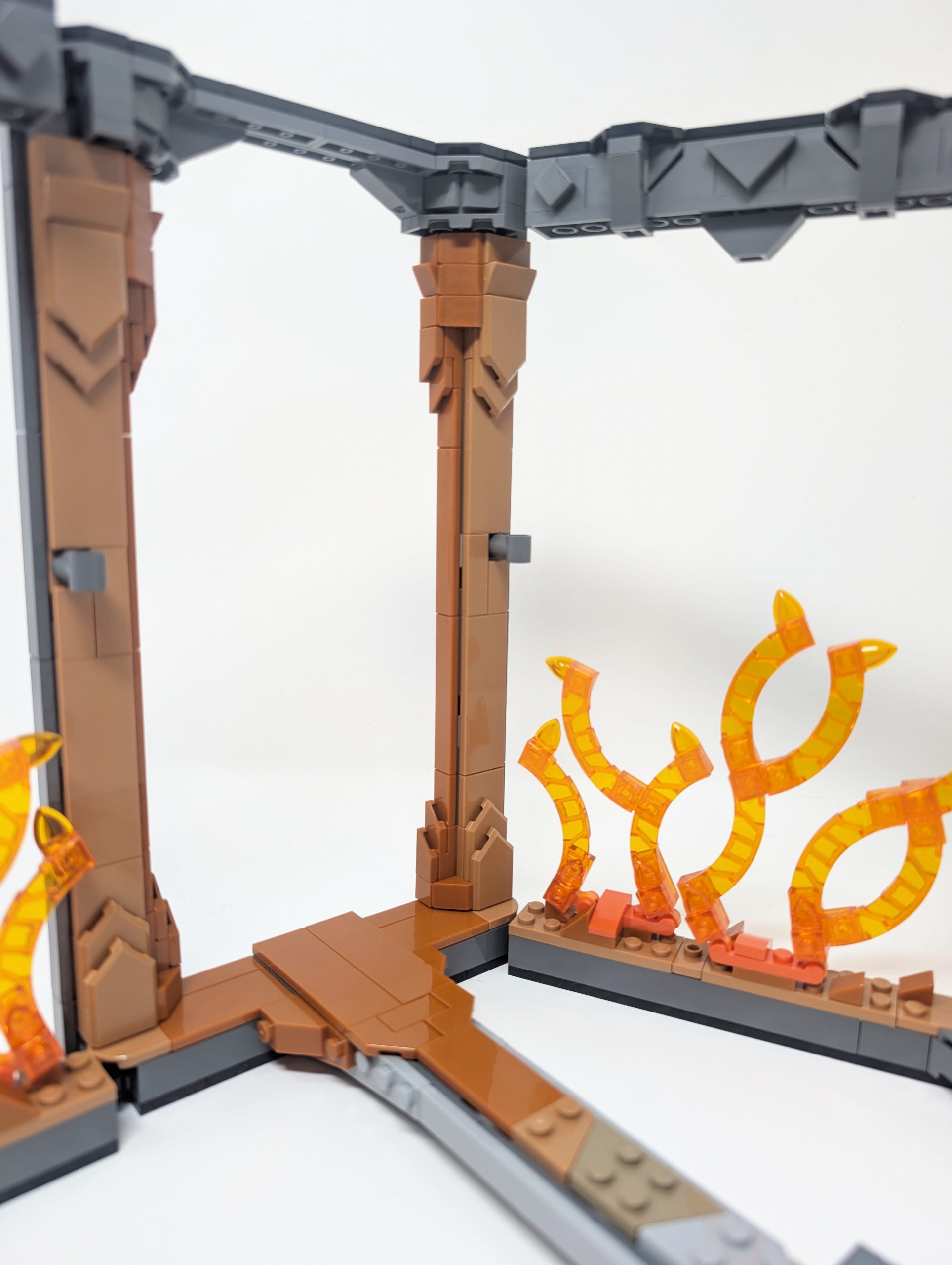 My favorite detail of the entire build is how the fire’s hues cast an illusion of heat against the stone walls. Through use of 312Medium NougatMedium Dark Flesh and 38Dark Orange we see the impact of heat grow. The deeper the orange, the hotter the glow appears, creating a gradual gradient effect that adds visual depth against the 199Dark Stone GreyDark Bluish Gray stone. The illusion works best from a distance as the colors blend with the 182Transparent Bright OrangeTrans-Orange effectively. Up close however the flames distract from what would otherwise be a beautiful heat gradient. It is interesting to note that the flames on the back of the Balrog are rather limited meaning that the fiery hues look a little bit muted, but we can use our immagination a bit here. When we look at the pillars themselves we see the effective use of SNOT (Studs Not On Top) technique in full force, allowing for a layered tile adding a smooth texture. This intricately detailed surface evokes the details of Moria’s dwarven architecture and shows the care the Dwarves took in building, although looks a little too nice given the state Moria is in when this scene occurs.