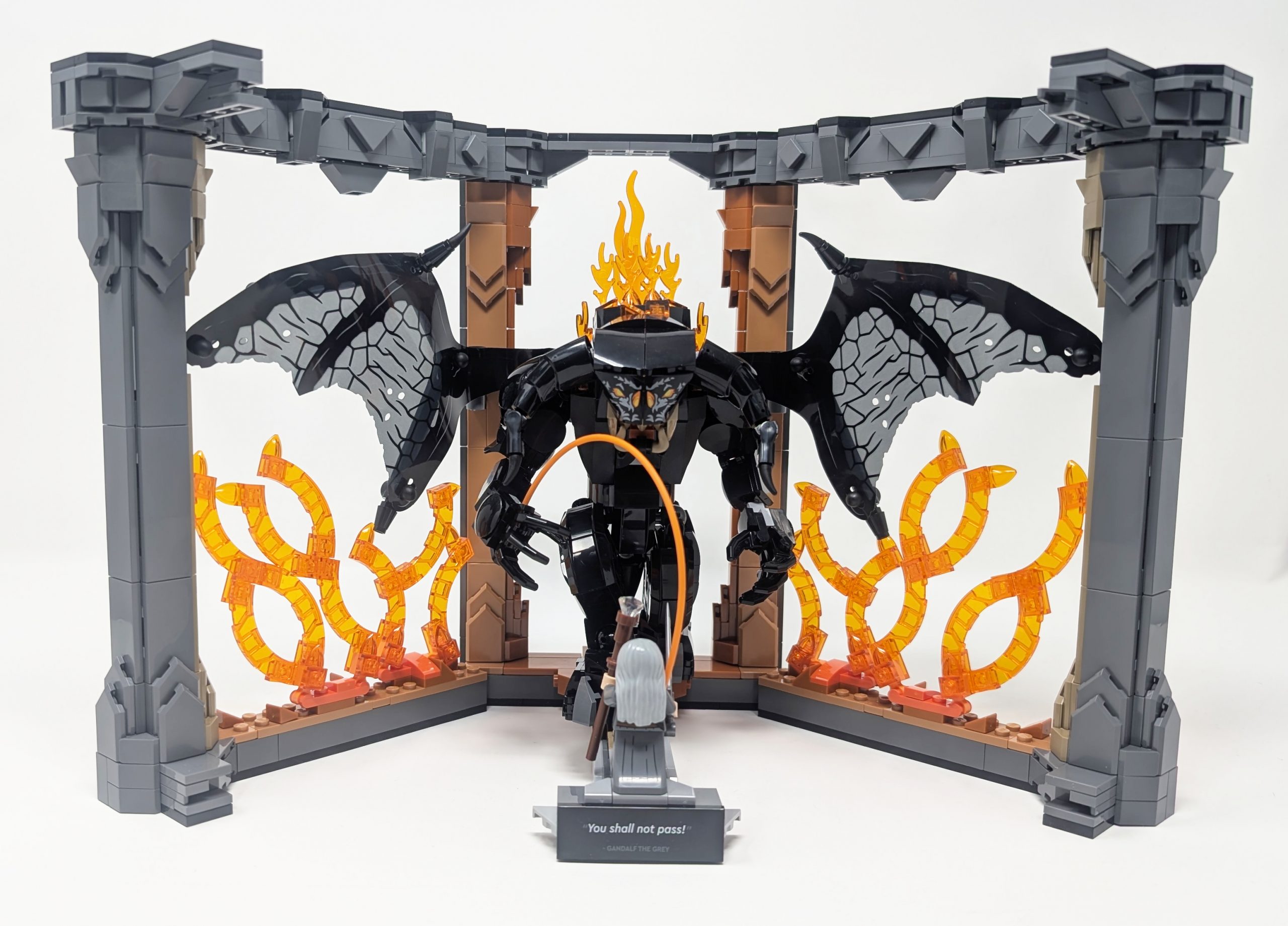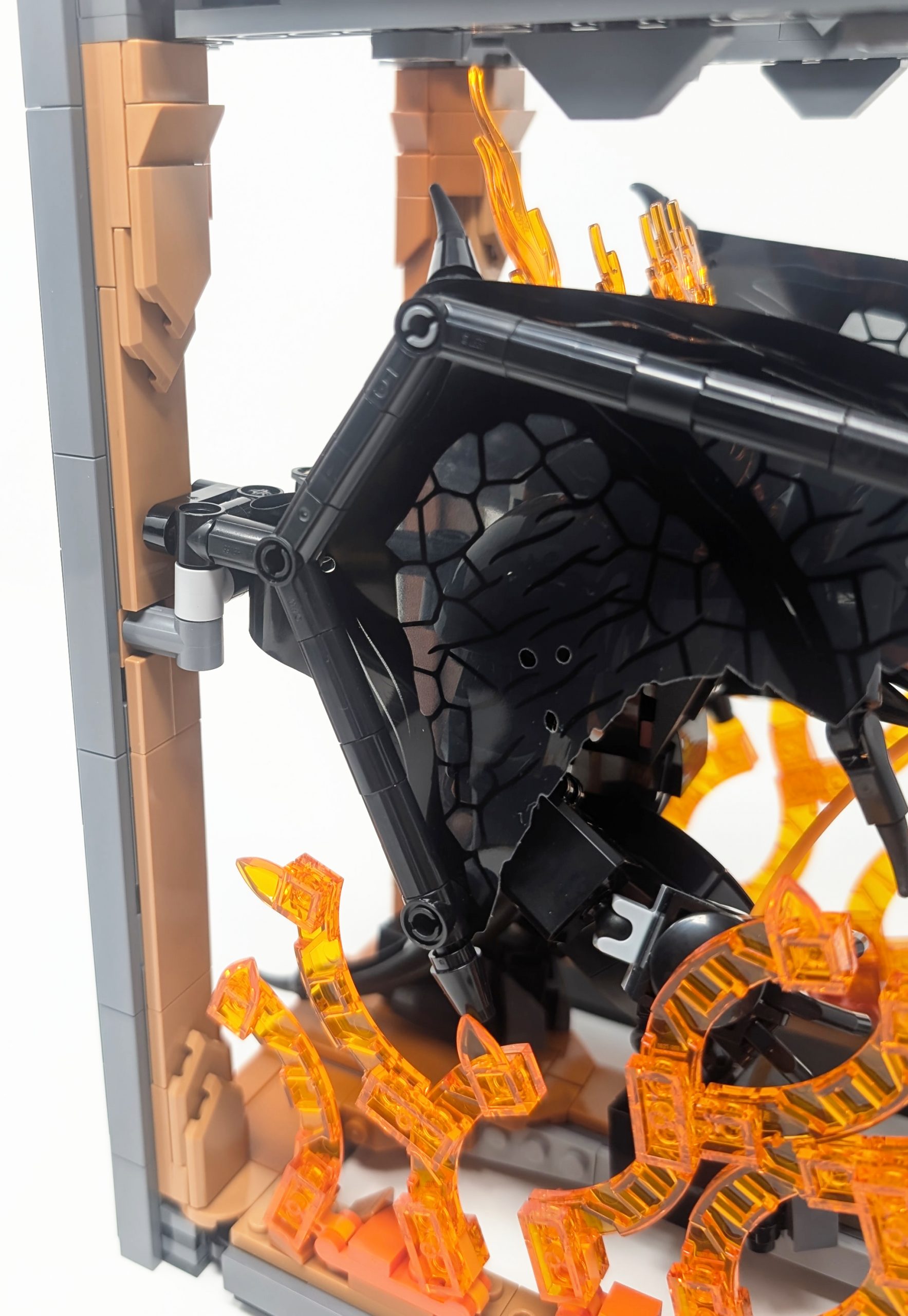 Once the Book Nook is opened it reveals the diorama in its full glory. While the expanded view is undeniably striking with its shape, color and size, it also amplifies the repetitive nature of the build. The symmetrical pillars and mirror flame placements make the scene feel a little less dynamic. Although the fire elements use 182Transparent Bright OrangeTrans-Orange to evoke heat and chaos, the shape falls short in terms of realism. They resemble styalized crystals more than actual flames. If you don’t look too closely however it looks great, as the contrasting colors and shapes are visually appeasing, just not Book Nook appeasing. One clever mechanic, however, elevates the build greatly. As the Book Nook opens, the Balrog’s wings unfurl in tandem, dramatically increasing the scale and adding a sense of movement to what otherwise would be a static display.