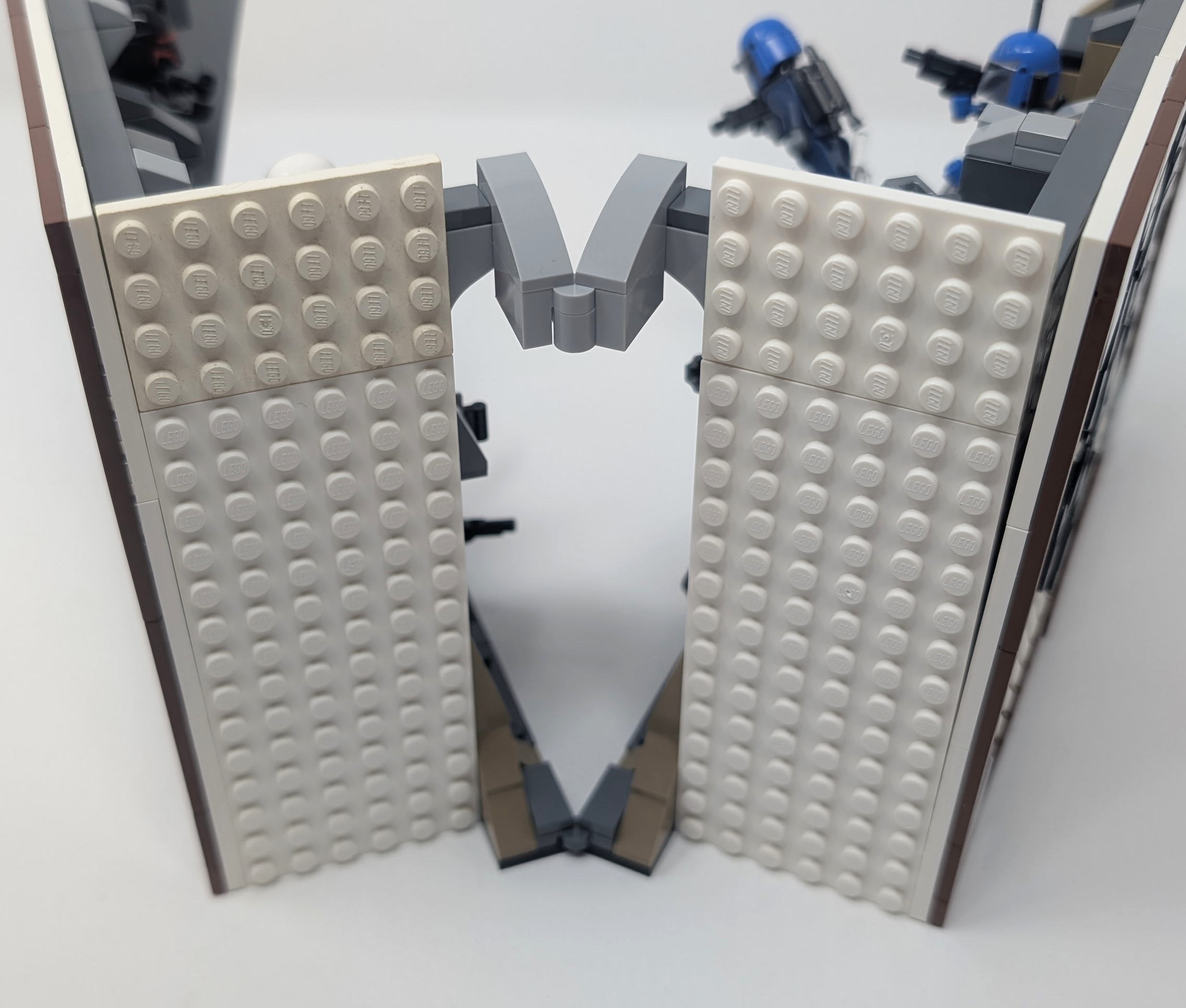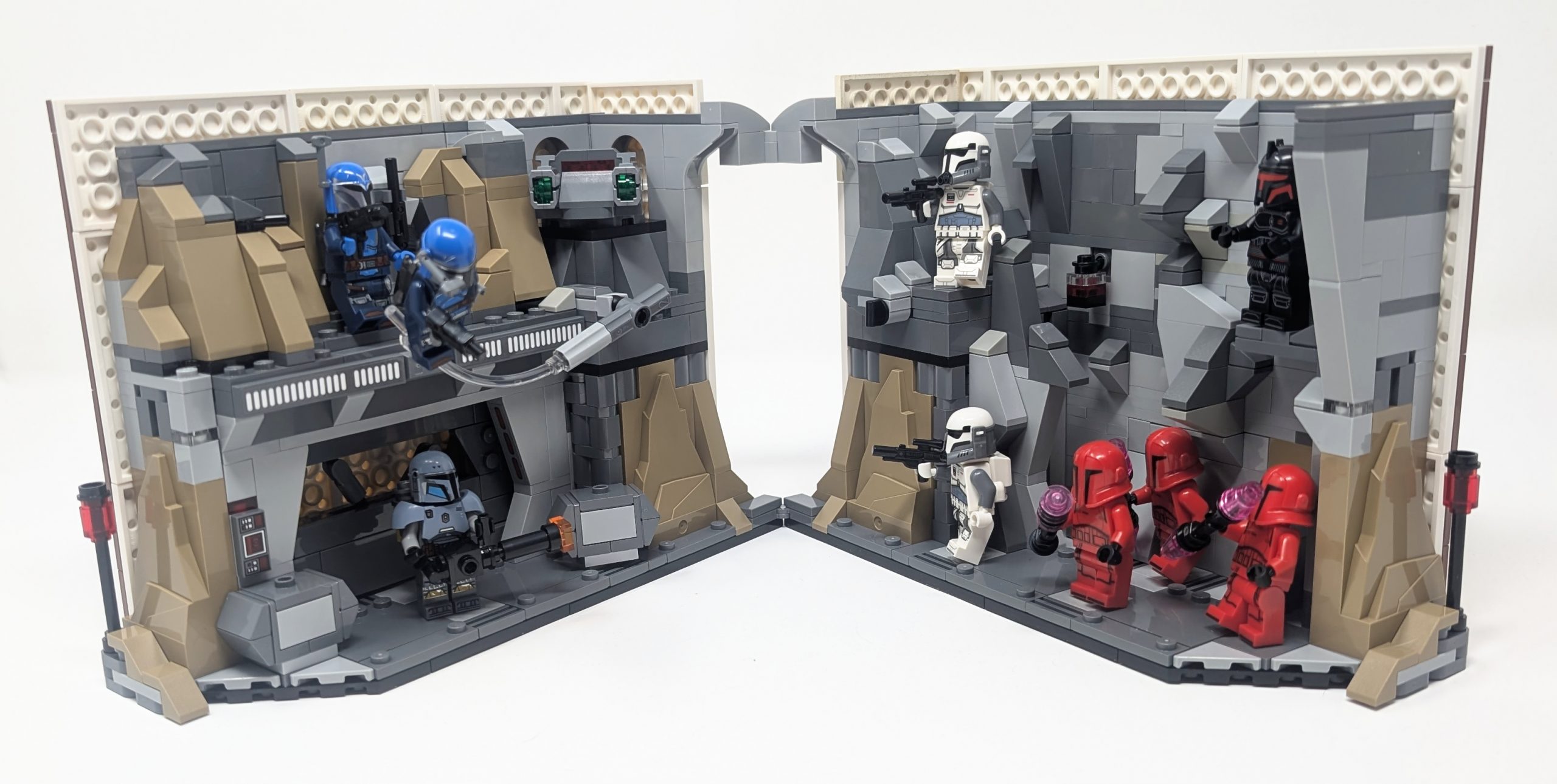 Inspired by the dramatic ambush scene from The Mandalorian Season 3, Episode 7, I set out to create a custom LEGO book nook that captures the tension and chaos of that moment and use some of the techniques I learned building the other two Book Nooks in this article. Using two copies of #75386 Paz Vizsla and Moff Gideon Battle, one copy of #75373 Ambush on Mandalore Battle Pack and supplementing with my own parts I tried to recreate the rocky cave setting where the ambush unfolds.