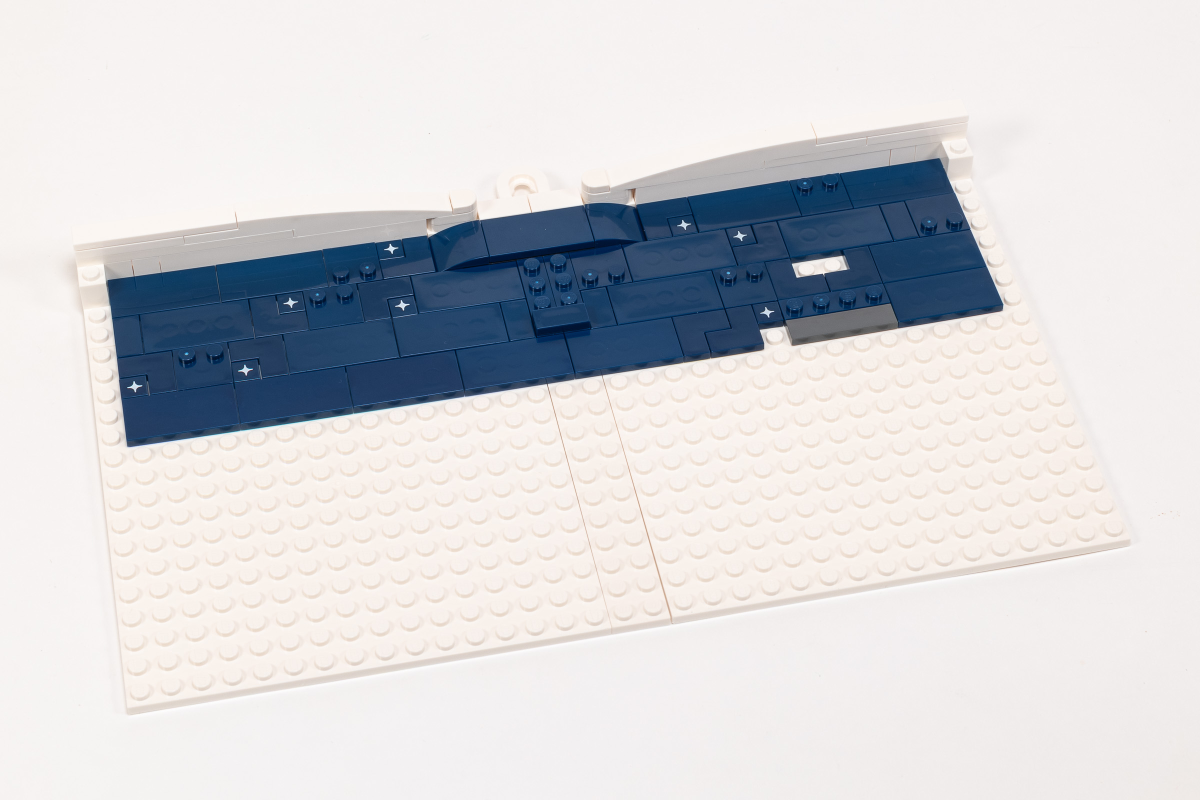 The First Bag begins to build a large frame out of white plates and bricks. We quickly add some 140Earth BlueDark Blue tiles, which confirms that this will form the backdrop of the model. This bag also requires the two 16×16 Plates from the unmarked plastic bag to create a larger canvas. It’s not super exciting to attach all the 140Earth BlueDark Blue tiles, but doesn’t take very long either.