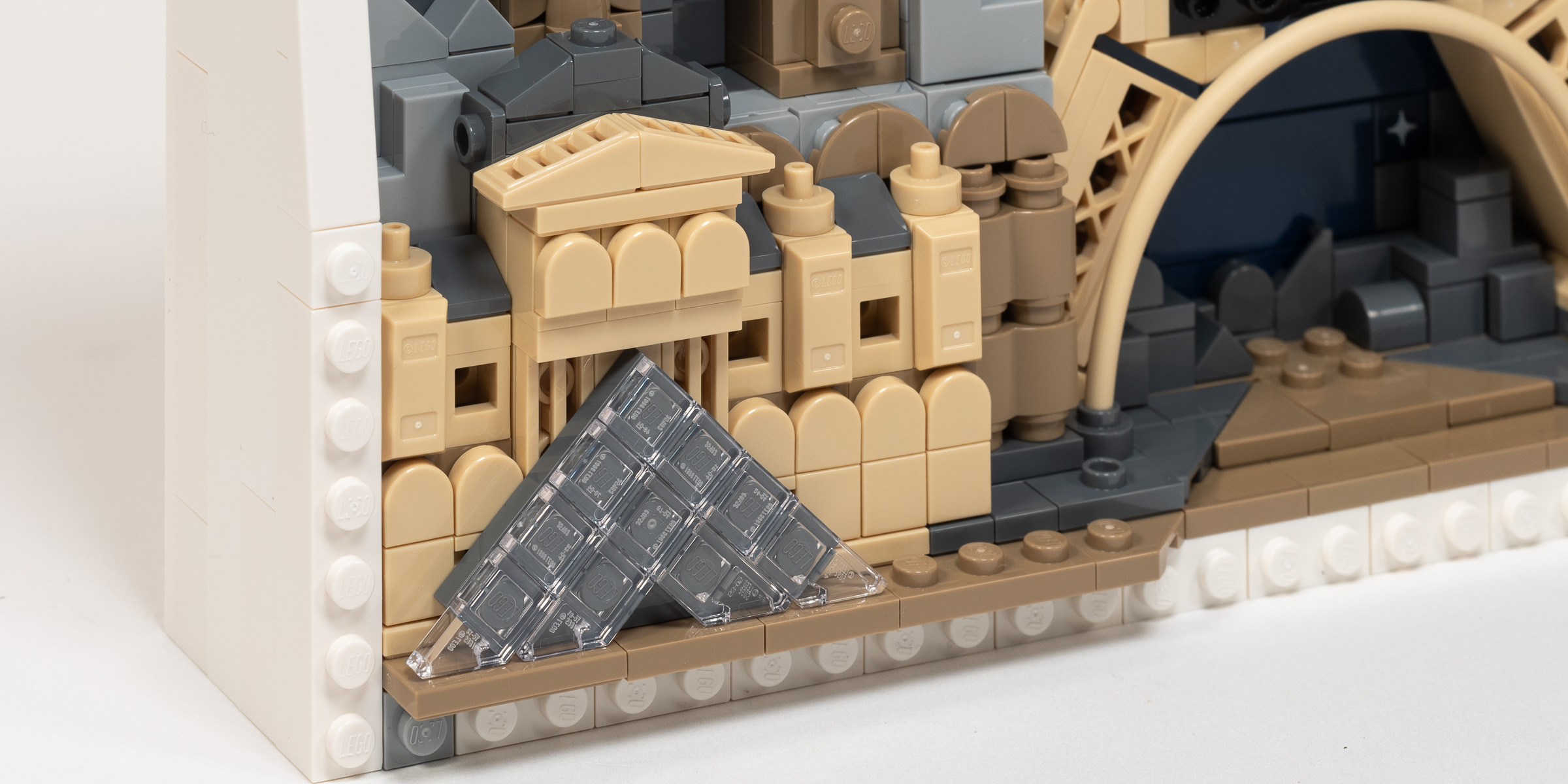 Bag 5 adds two more buildings to the model. A flat interpretation of the iconic Louvre museum sits below and in front of the Arc de Triomphe. It’s a pretty simple rendering with a wing of the museum on either side of the iconic glass pyramid entrance which was added to the middle of the plaza by architect I.M. Pei in 1989. The pyramid is flat in this version, which looks weird up close but looks good from further away.