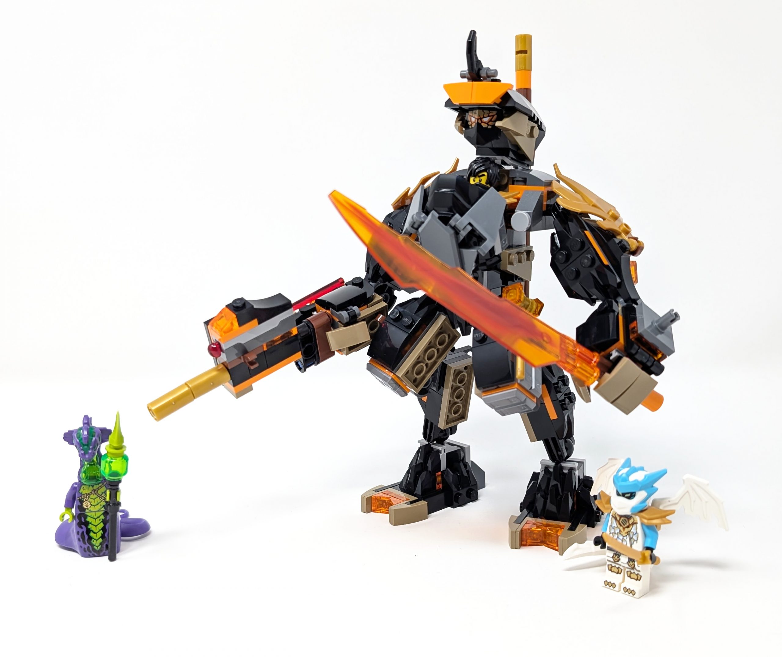 The Earth Monster mech reminds me of Kai’s mech we saw in #71851 Kai’s Dragon Mech Battle Pack, only this time more detailed and improved. Seeing this mech only makes me wish Kai’s mech matched this level of detailing. The mech itself has 9 pivot points allowing for a wide range of motion and is built to be a larger version of its Earth Monster pilot, from its color to its claws. When I see this I think of it as a Ninjago style Hulk Buster from the Marvel universe. A fun detail I liked is that the pilot when not piloting the mech holds new printed claw pieces, which turn into shoulder detailing when not wielded, giving the weapon a dual purpose.