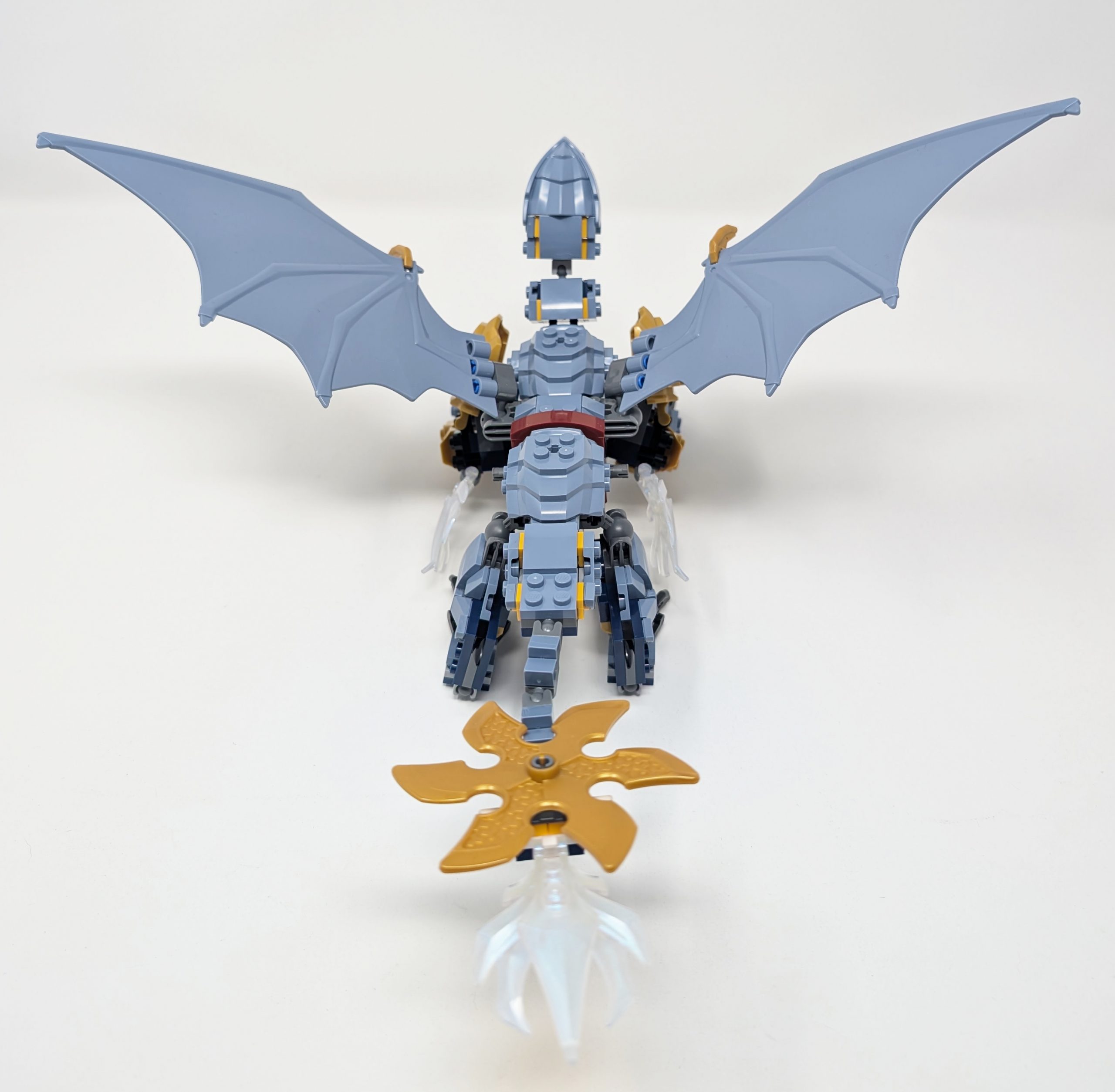 The smallest of the two included dragons (not counting the Dragon Form Ninja minifigures of course) is released in #71855 Ninja Dragon Riyu’s Battle. Of the larger sets in this wave, this set is the second least favorable when it comes to price per part, but a big chunk of this is due to the sheer number of large parts included in the set. Whether it be 297Warm GoldPearl Gold pieces of armor or the plethora of 212Light Royal BlueBright Light Blue elements that make up the dragon itself, the size of the parts drives the price up. This is a reason why price per part is not always the best measure of value as a large wing cannot be compared to a singular tile or plate in terms of what you get for your money. While shape and substance make up the bulk of what makes this build a fun yet great build, it is the color that speaks out to me the most. The muted yet distinct 212Light Royal BlueBright Light Blue used captures a new color for many of the pieces included, allowing for a dragon color that is different to the usual shades of green, red or black we see in other sets.