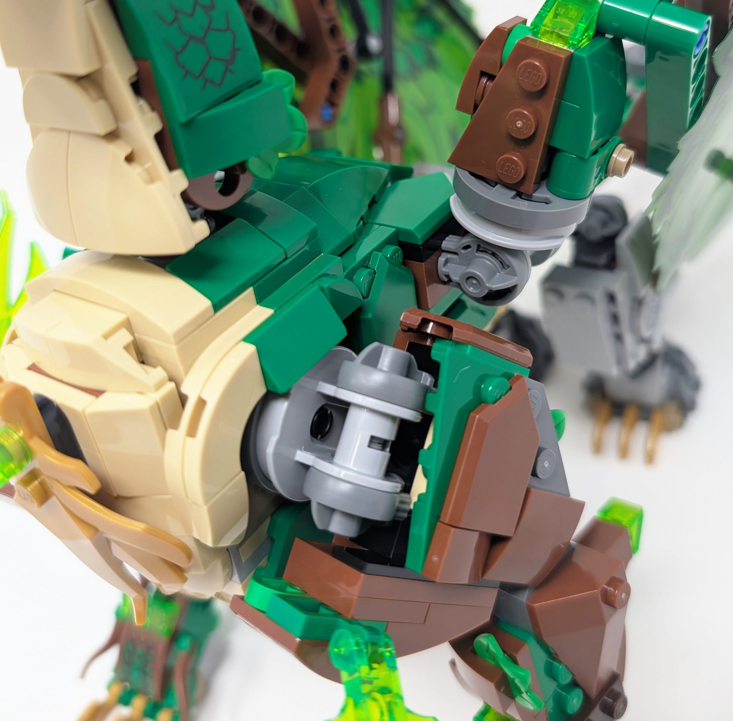 There is no part of the Dragon of Life that is not packed with detail. With the exception of the top of the head and a few stickered pieces, the majority of the details are accomplished through brick construction detailing. Even the underbelly is detailed with smooth tile construction, highlighting the soft contrast against the harsh scales on the upper exterior. When looking from the front you can see all the posability options this dragon comes with, these including a posable jaw, head, neck, legs, ankles, claws and tail. Pretty much everything is posable. My favorite detail however has to be the Dragon of Life’s head. Its grimacing visage is beautifully detailed, with a lower jaw that can be lowered to expose tongue.