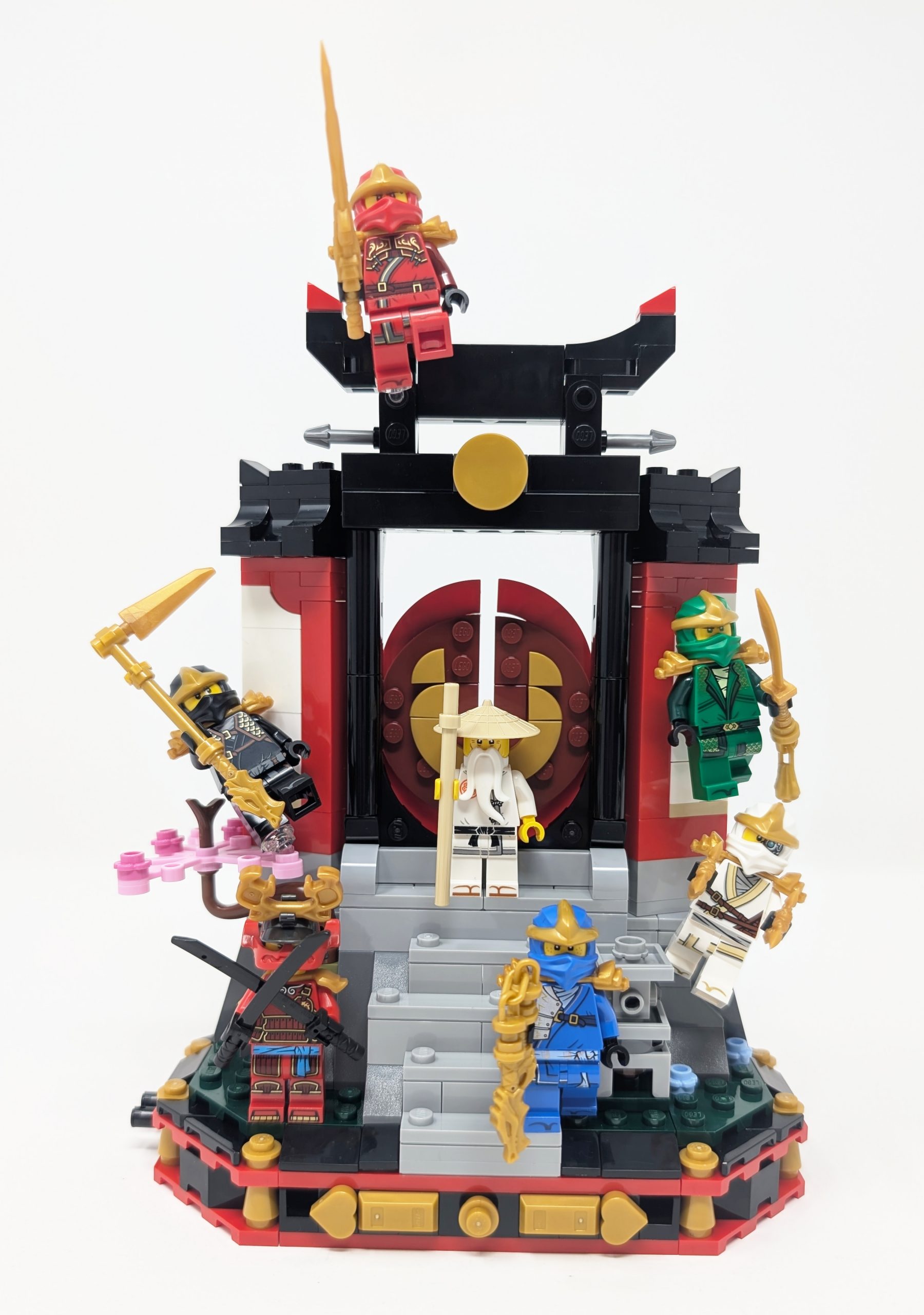 Aside from the walls and gate, the build itself rests atop a display stand helping round off the build and add side detailing to let it display well as a standalone set. SNOT (Studs Not On Top) edge detailing helps create the ornate look as the 297Warm GoldPearl Gold contrasts against the 21Bright RedRed and 26Black of the rest of the base. As the Ninjago sets we looked at prior lacked much architectural structures it was welcoming to see this beautiful and filling structure that does a great job at capturing just as much detail as is needed for a small display piece, while not deviating away from the main goal of this set, that being to serve as a decorative character display that will be built upon with each 15th anniversary minifigure you collect.