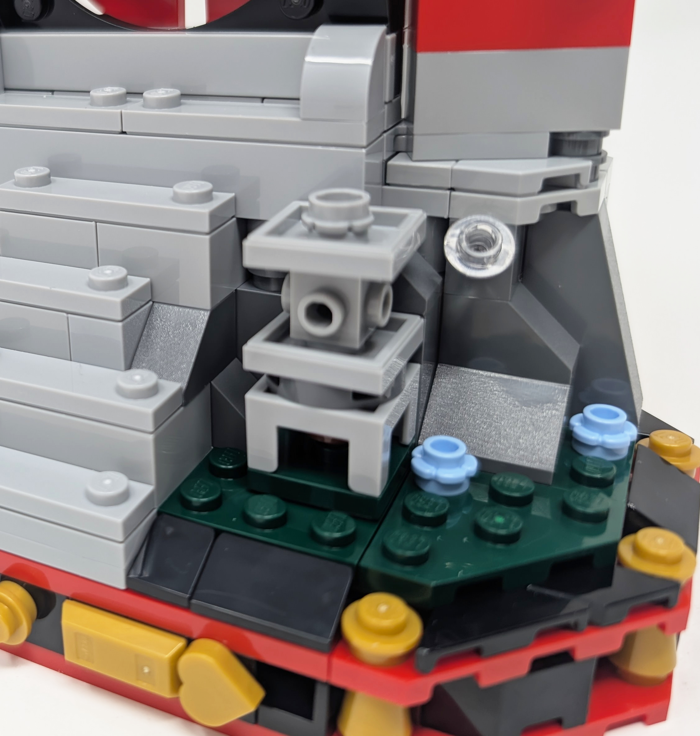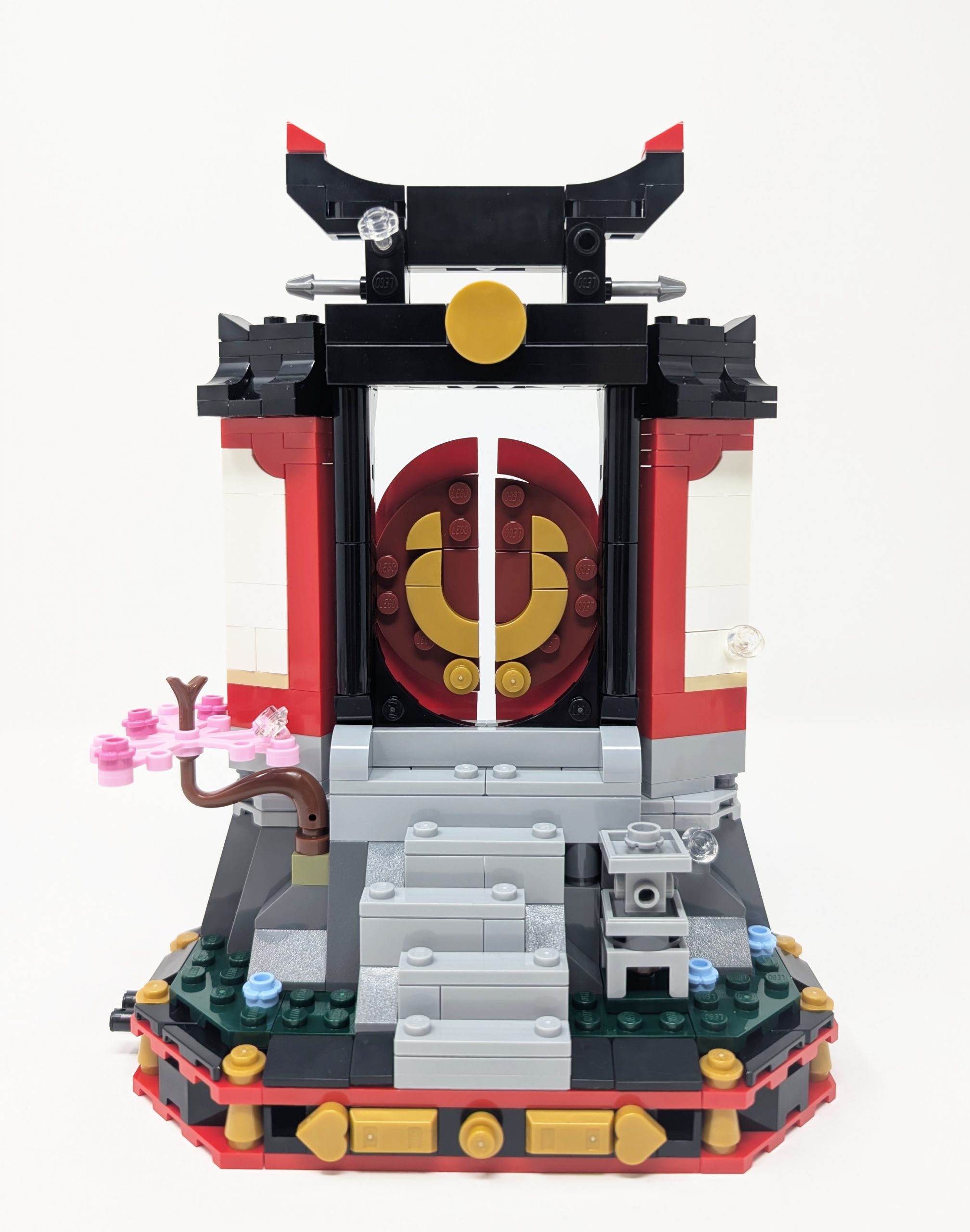 When the minifigures are removed you can see the slice of the monastery much clearer. The monastery is based off the Monastery of Spinjitzu, built atop the tallest mountain in the Ninjago universe. This is not the first time this monastery has been released in a set, with 2019 seeing the entire structure released in set 70670 Monastery of Spinjitzu. As this is a smaller, more affordable display piece the entire monastery is not needed, instead focusing on just the entryway and the steps leading up to it. Due to its smaller more limited scale the designers are able to add a lot more detailing, whether it be through the great angled construction in the 21Bright RedRed and 1White walls or the traditional 1White roof. All of the structures borrow from iconic Japanese architecture of the 10th to 12th century. I was especially impressed at how the designers were able to effectively get curves for the top of the wall using two sloped pieces resting on each other to give the wall a less uniform blocky look. While the entry way looks great, the 297Warm GoldPearl Gold tile at the top of the doorway feels like it is missing detailing, something that could have been accomplished through a sticker or a print.