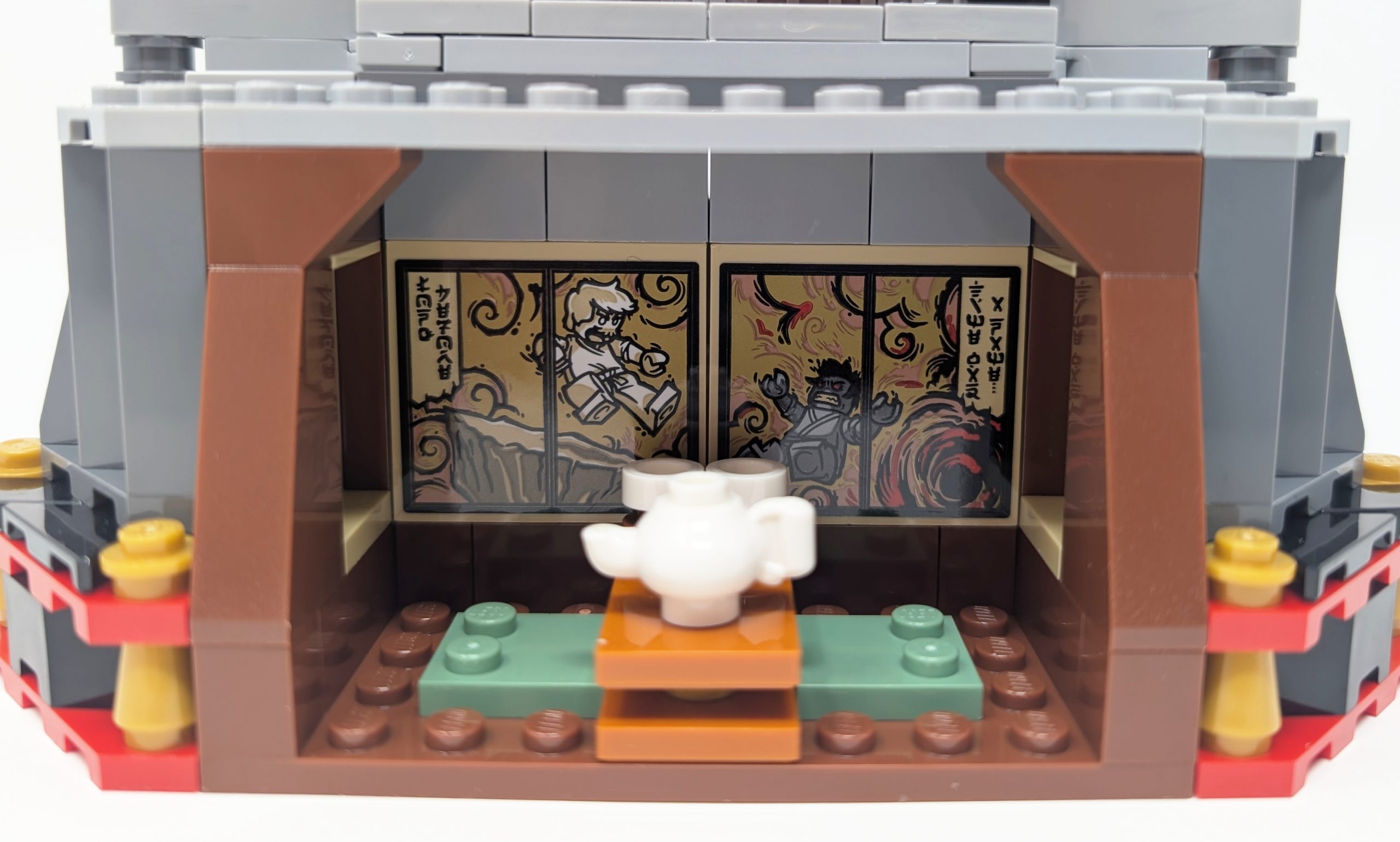#71866 Ninja Character Display 15th Anniversary is intended to be a display piece and as such the majority of the pieces are used on the front exterior, but that doesn’t mean there are no hidden details. Tucked in the back is the monastery’s tearoom with a stickered mural depicting an iconic battle scene between brothers Wu and Garmadon from the first season of the Ninjago show. The stickered scene looks so great that even though I had not watched the show I dug through the internet to find a grainy copy of the scene. As history is always told by the victor, there was some creative liberty Wu took in the depiction of the scene in the mural, but the mural is great nontheless.