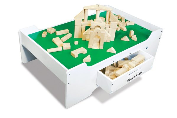 - Melissa & Doug Wooden Multi-Activity Play Table – While it doesn’t come with a LEGO-compatible building surface, this is one of the best options I can find, with a large drawer for storing LEGO bricks when they are not in use. you can always put LEGO-compatible adhesive baseplates on one side of the reversible table top if needed.